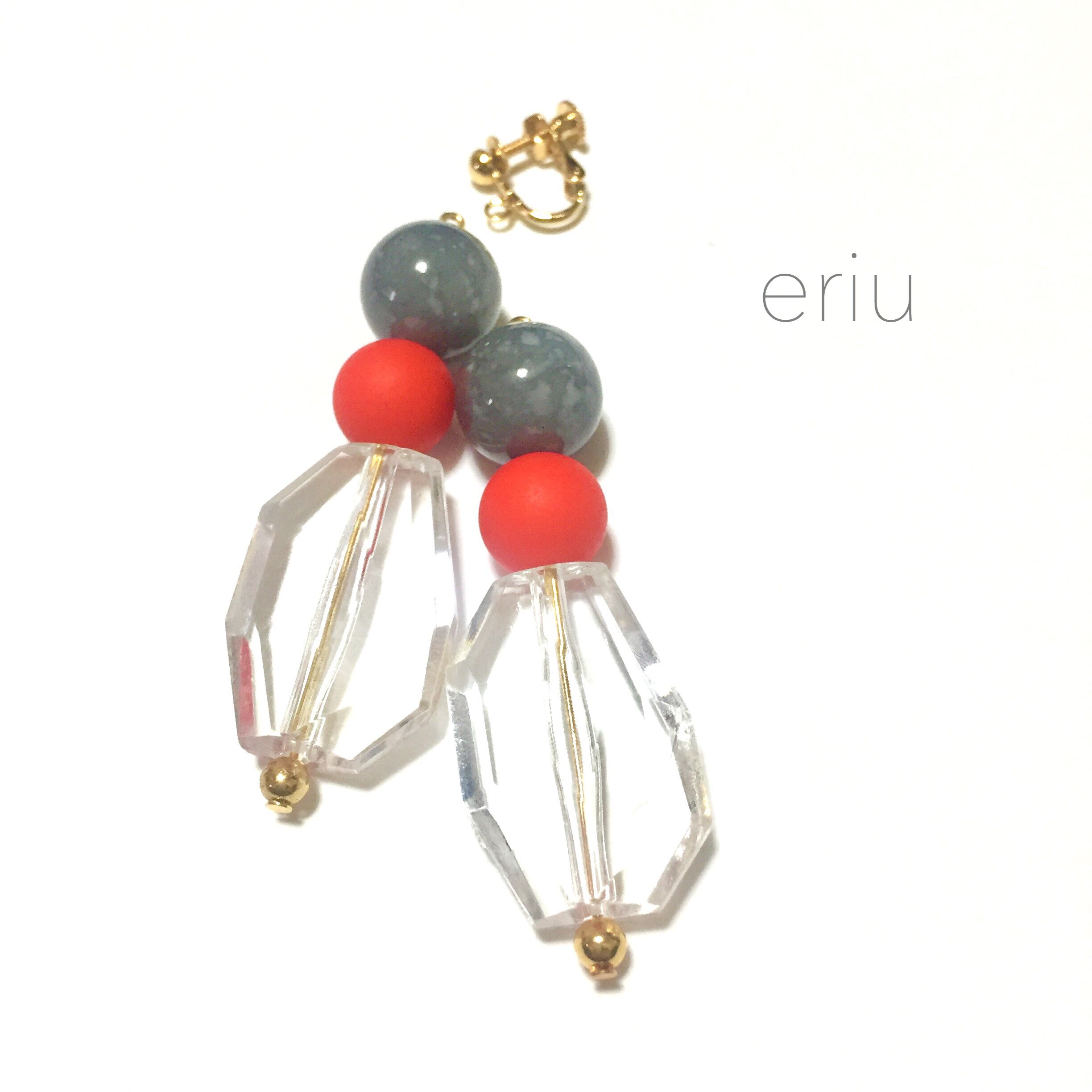 グレー×レッド×クリア 大ぶりイヤリング