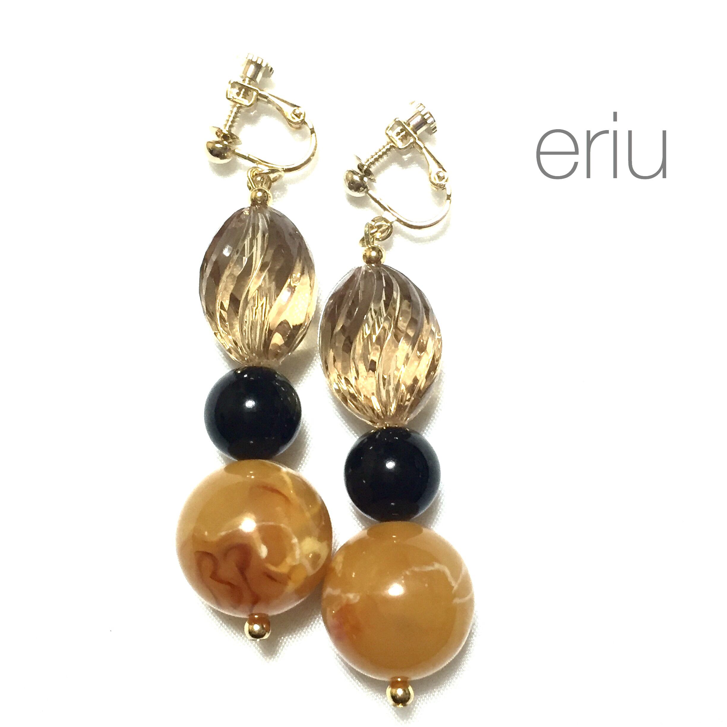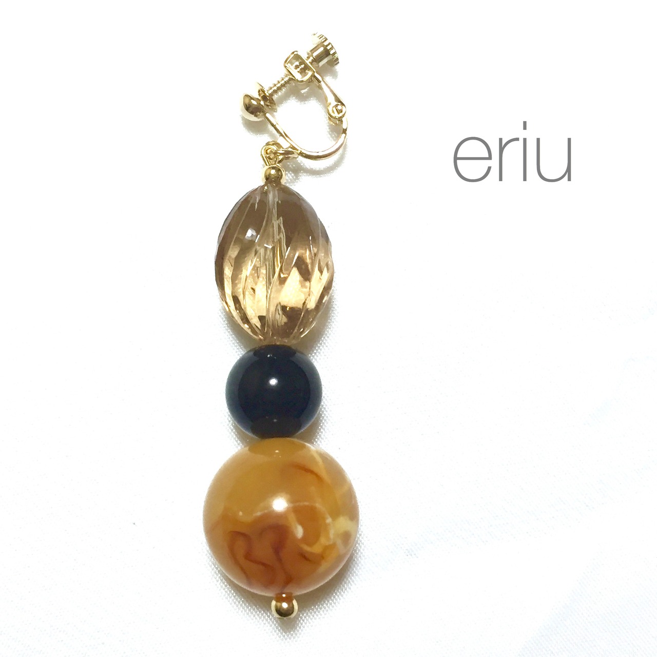 マスタードカラーのヴィンテージアクリルビーズにブラックのアクリルビーズとクリスタルシャンパンゴールドのアクリルビーズを組み合わせたeriu人気ナンバー1のイヤリングです。