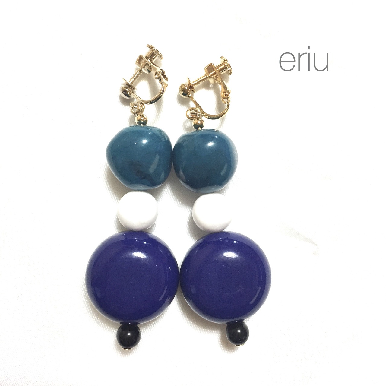 ブルーとネイビーのヴィンテージアクリルビーズとホワイトのアクリルビーズを組み合わせた大ぶりイヤリングです。