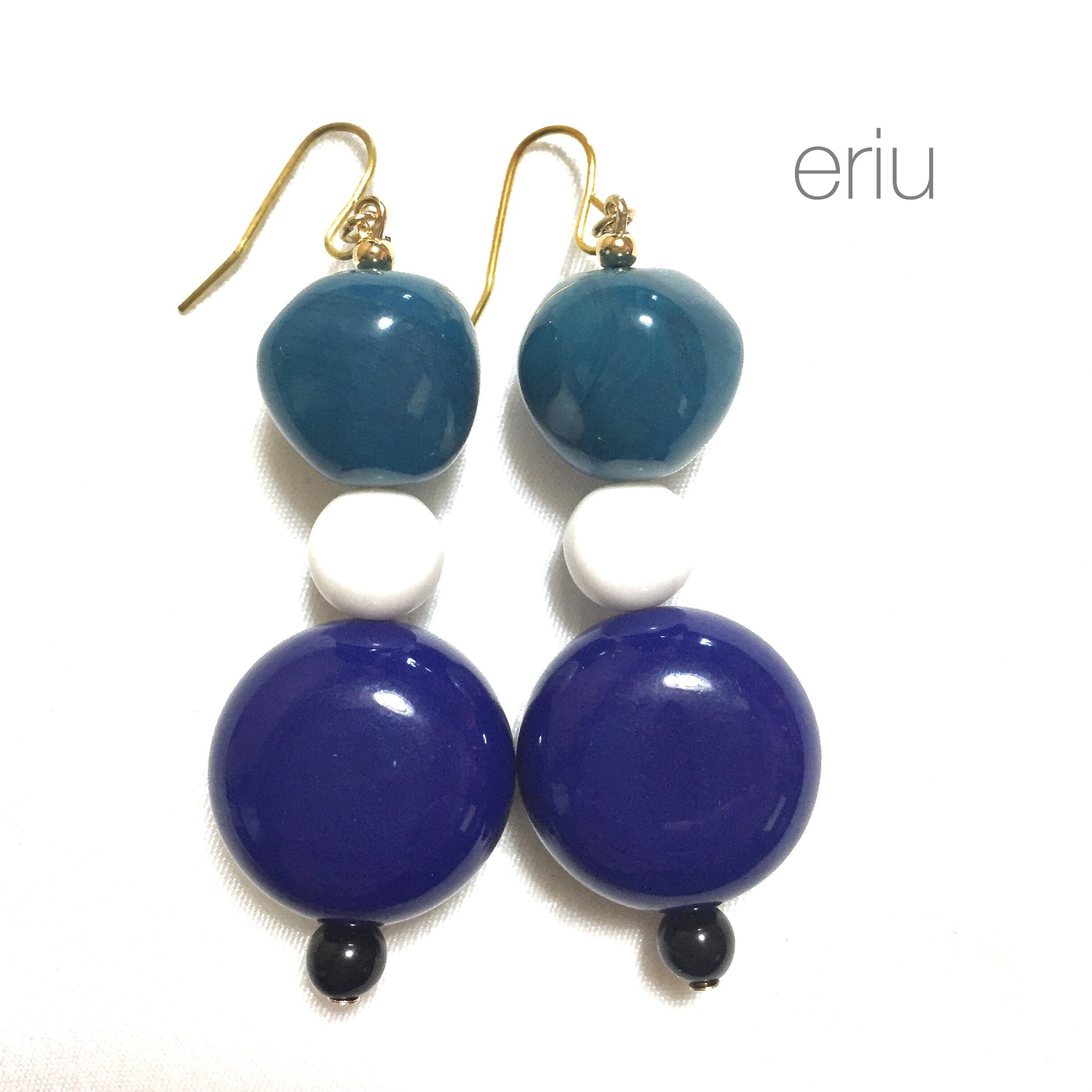 ブルーとネイビーのヴィンテージアクリルビーズとホワイトのアクリルビーズを組み合わせた大ぶりピアスです。