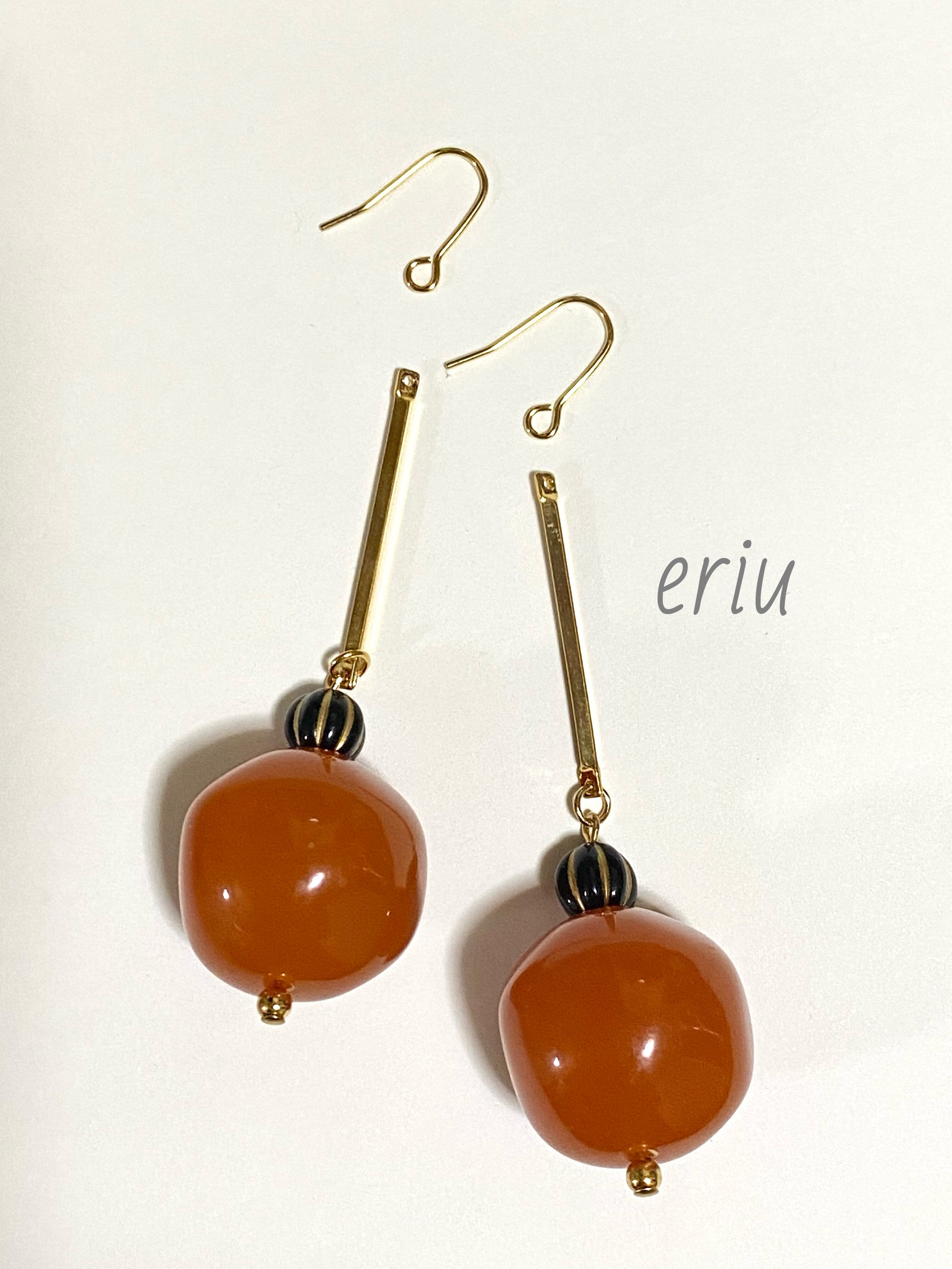 テラコッタのプックリしたアクリルヴィンテージビーズとブラックにゴールドのラインの入ったレトロビーズを組み合わせた、これからの春ファッションにもぴったりな大ぶりなピアスです。