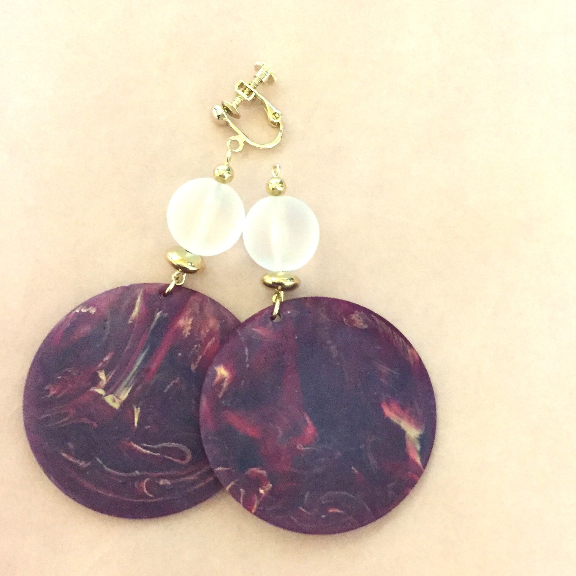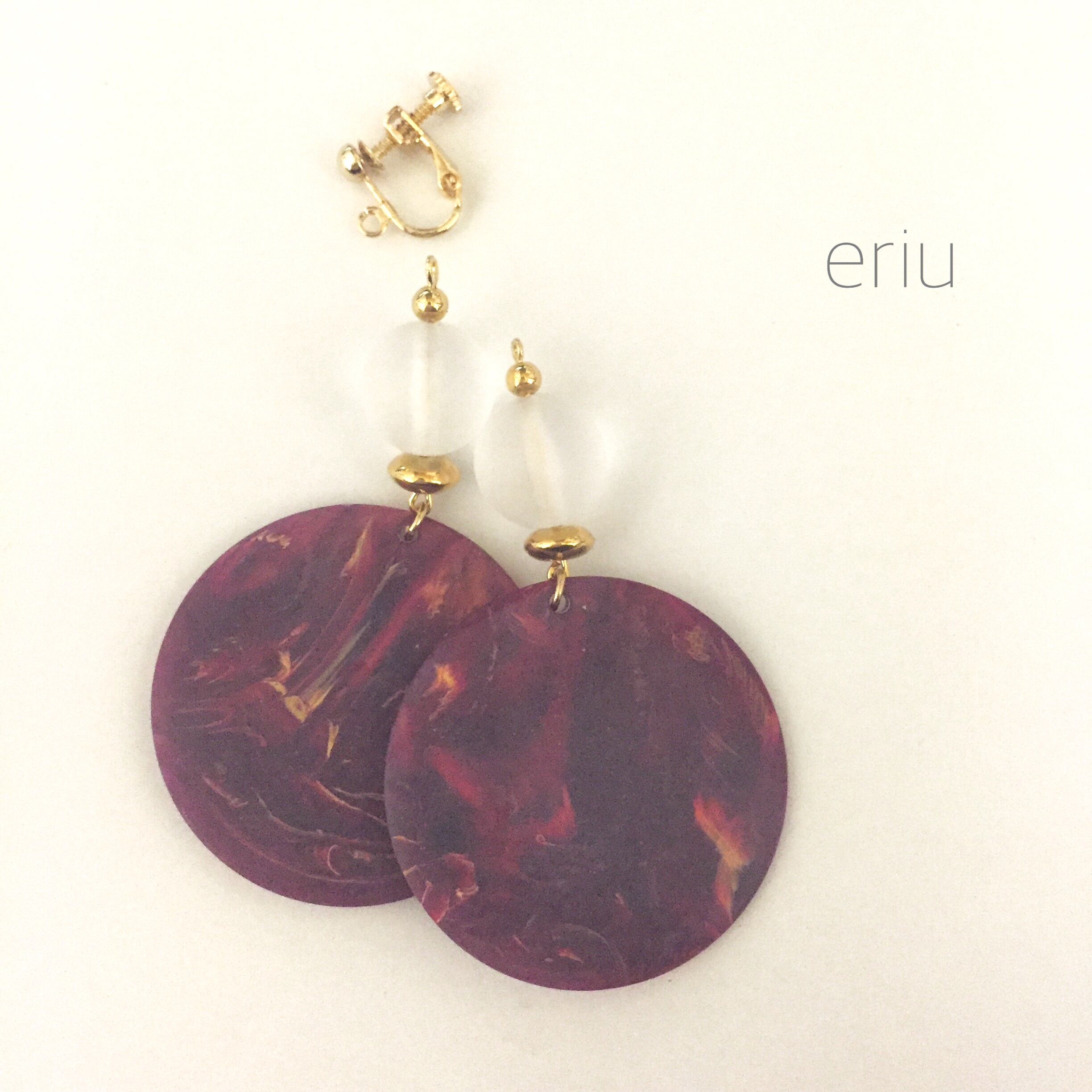 ダークチェリーマーブルのヴィンテージ サークルパーツの大ぶりイヤリングです。